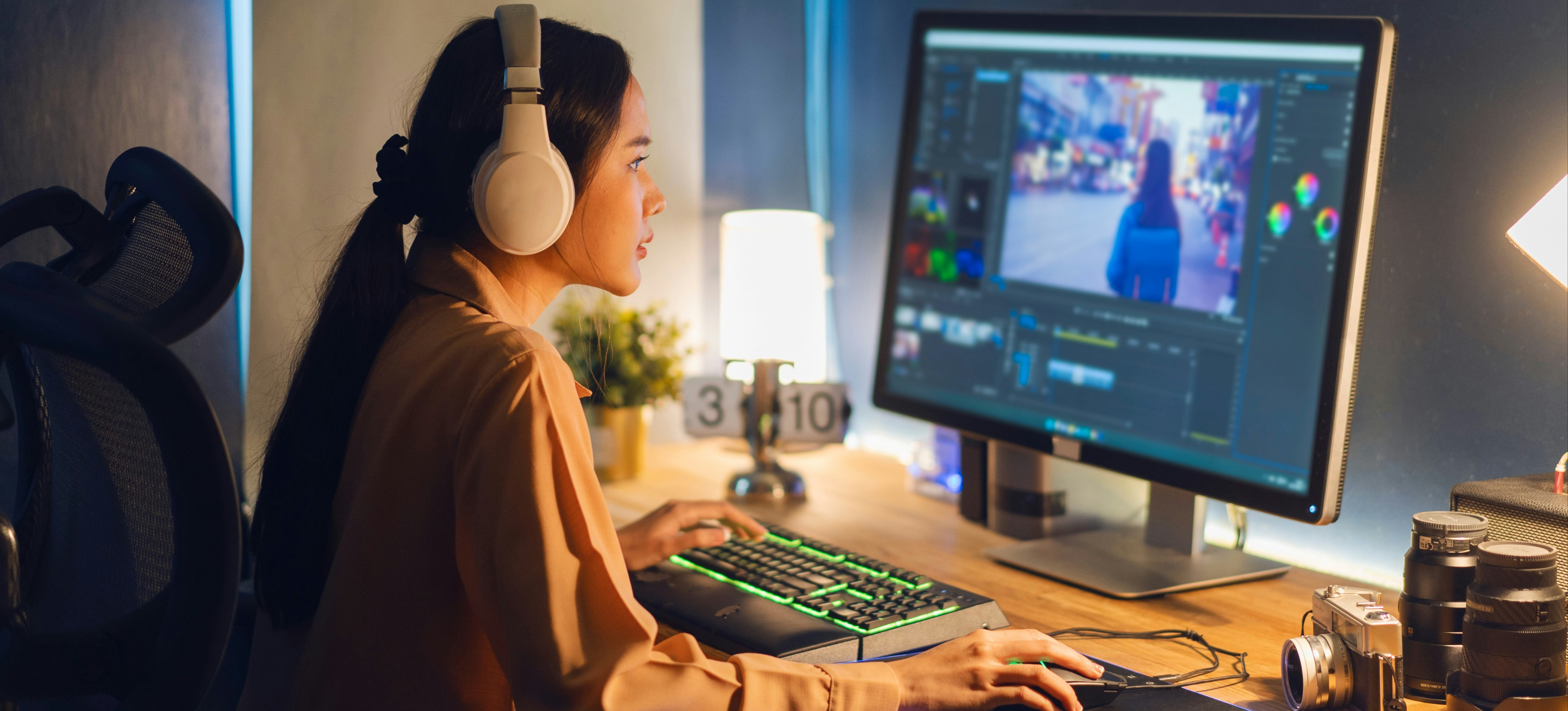 [Featured Image] A graphic designer working on a project in a home office focuses on their design work.