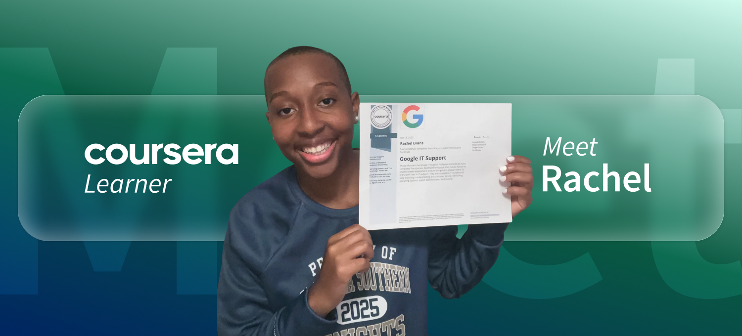 ![[Featured image] Coursera learner Rachel stands in front of a green background with the word "Meet" faintly visible behind her. The words "Coursera Learner" are on her left and "Meet Rachel" are on her right.](https://d3njjcbhbojbot.cloudfront.net/api/utilities/v1/imageproxy/https://images.ctfassets.net/wp1lcwdav1p1/2Cetl146Vb21wqYwuBeMWH/5b0d87fbf86a8828bd2579824a6d2f61/Rachel_E_lead_image.png?w=1500&h=680&q=60&fit=fill&f=faces&fm=jpg&fl=progressive&auto=format%2Ccompress&dpr=1&w=1000)