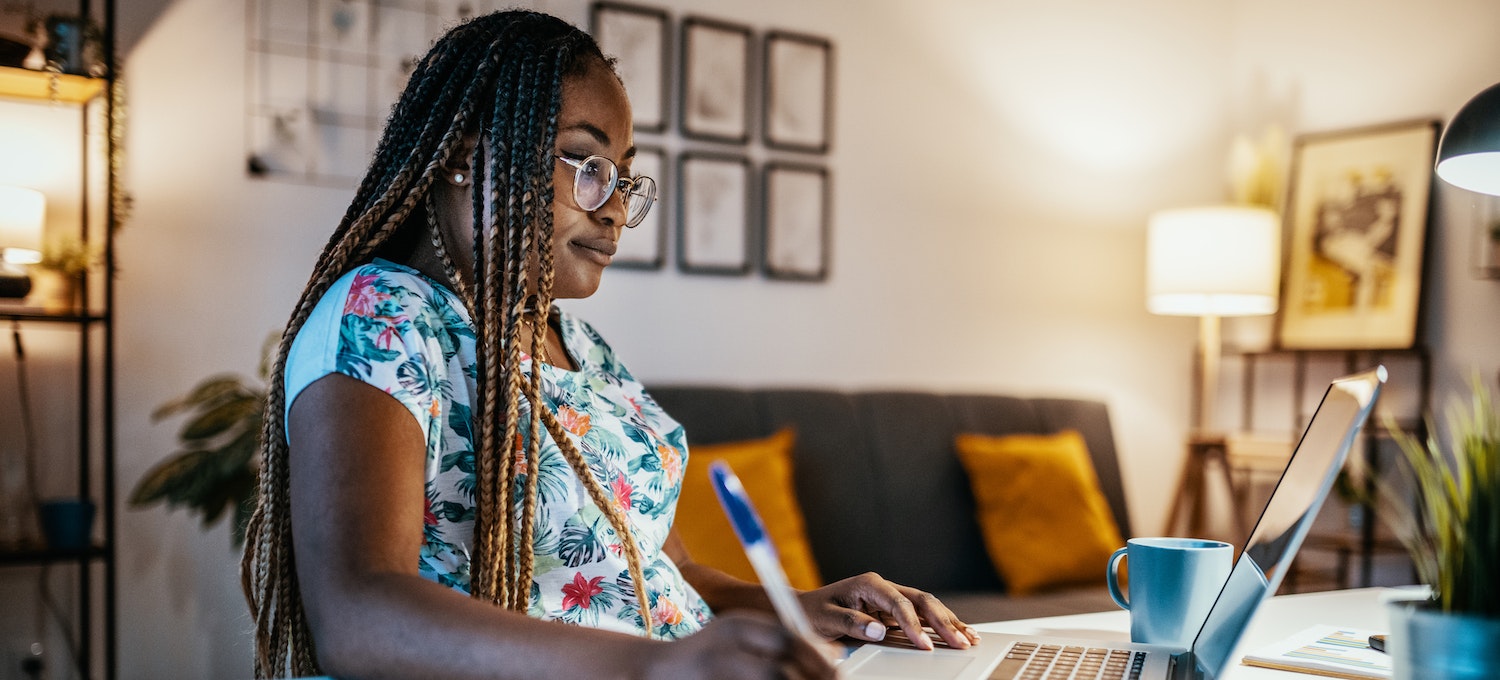 [Featured image] A master's in accounting student in glasses sits at home taking notes from something she reads on their laptop.