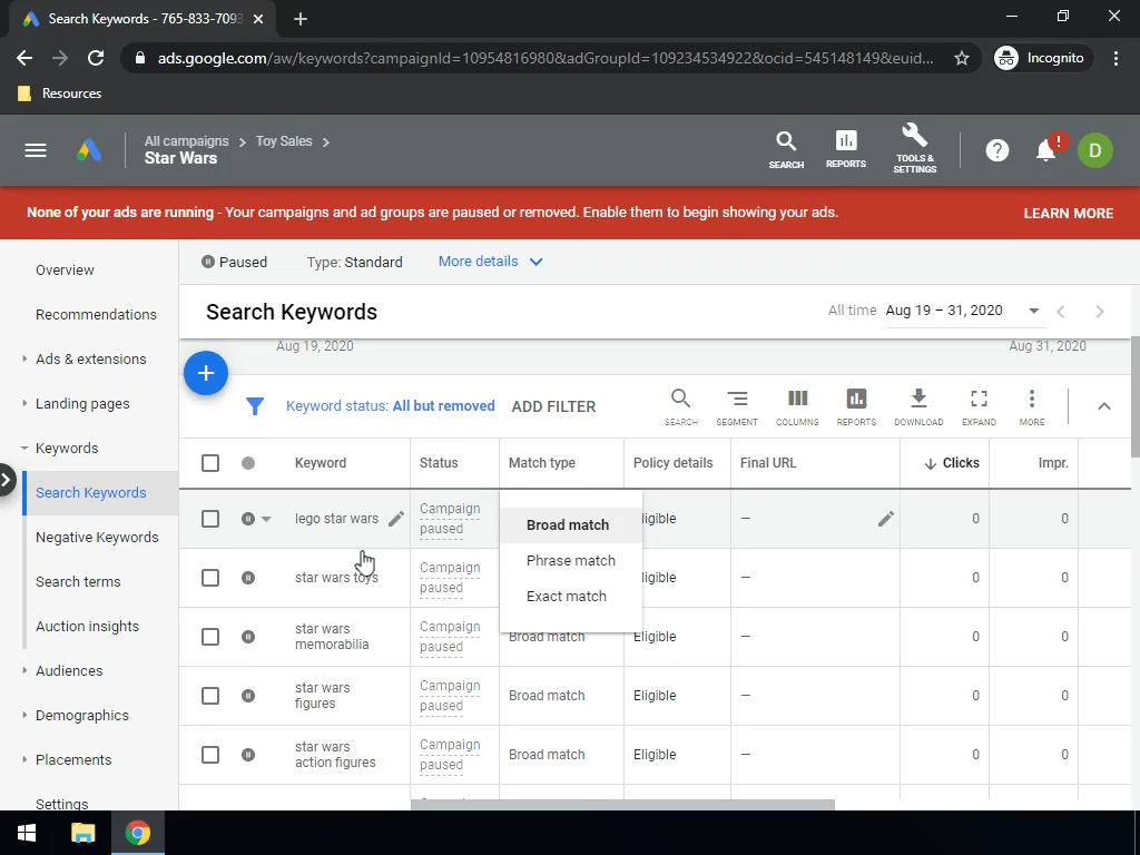 Pause and activate ad groups, personalize keyword match types