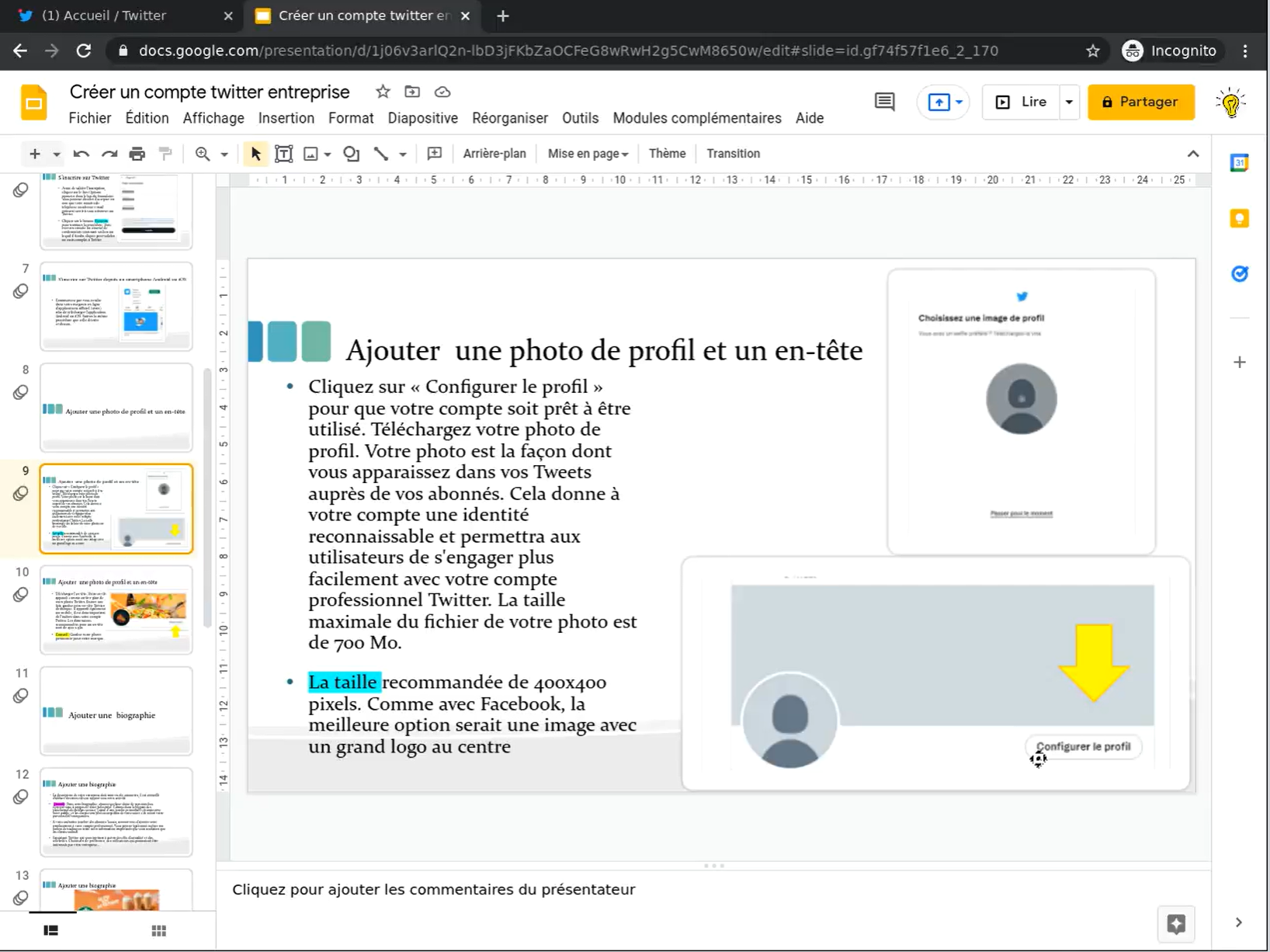 Dans ce projet guide d'une heure, on va voir comment on peut créer un compte Twitter professionnel pour une entreprise, ajouter une photo de profile et d'en-tête, une biographie, un thème de couleur, un site web, localisation, suivre des personnes et publier une tweet.