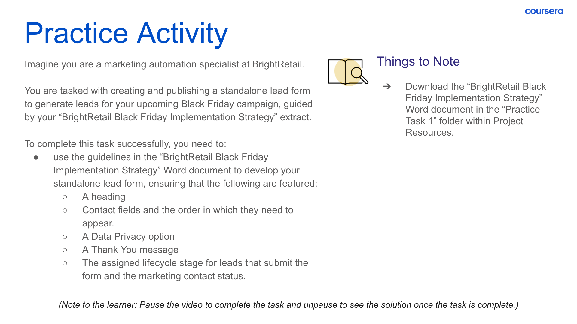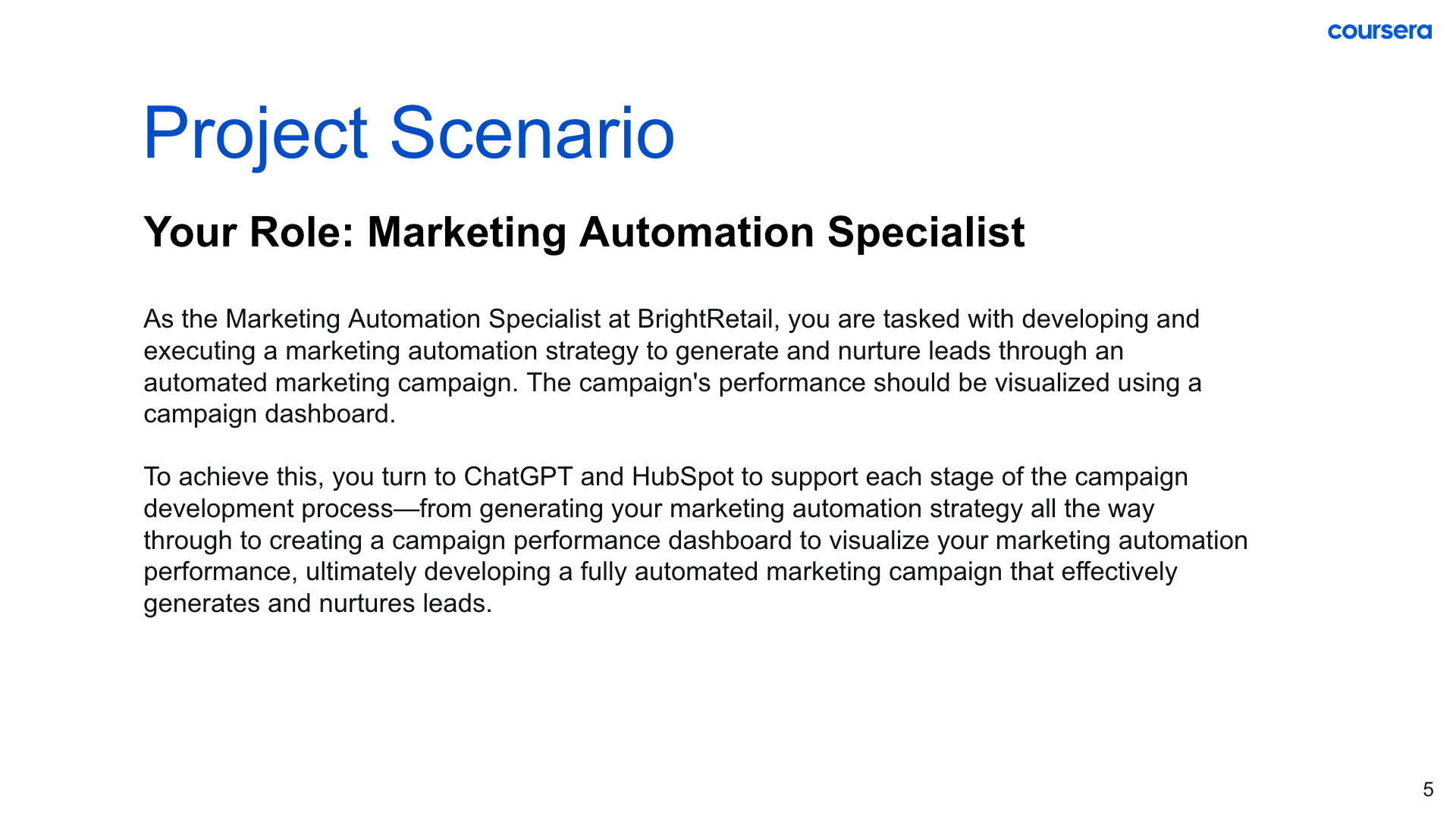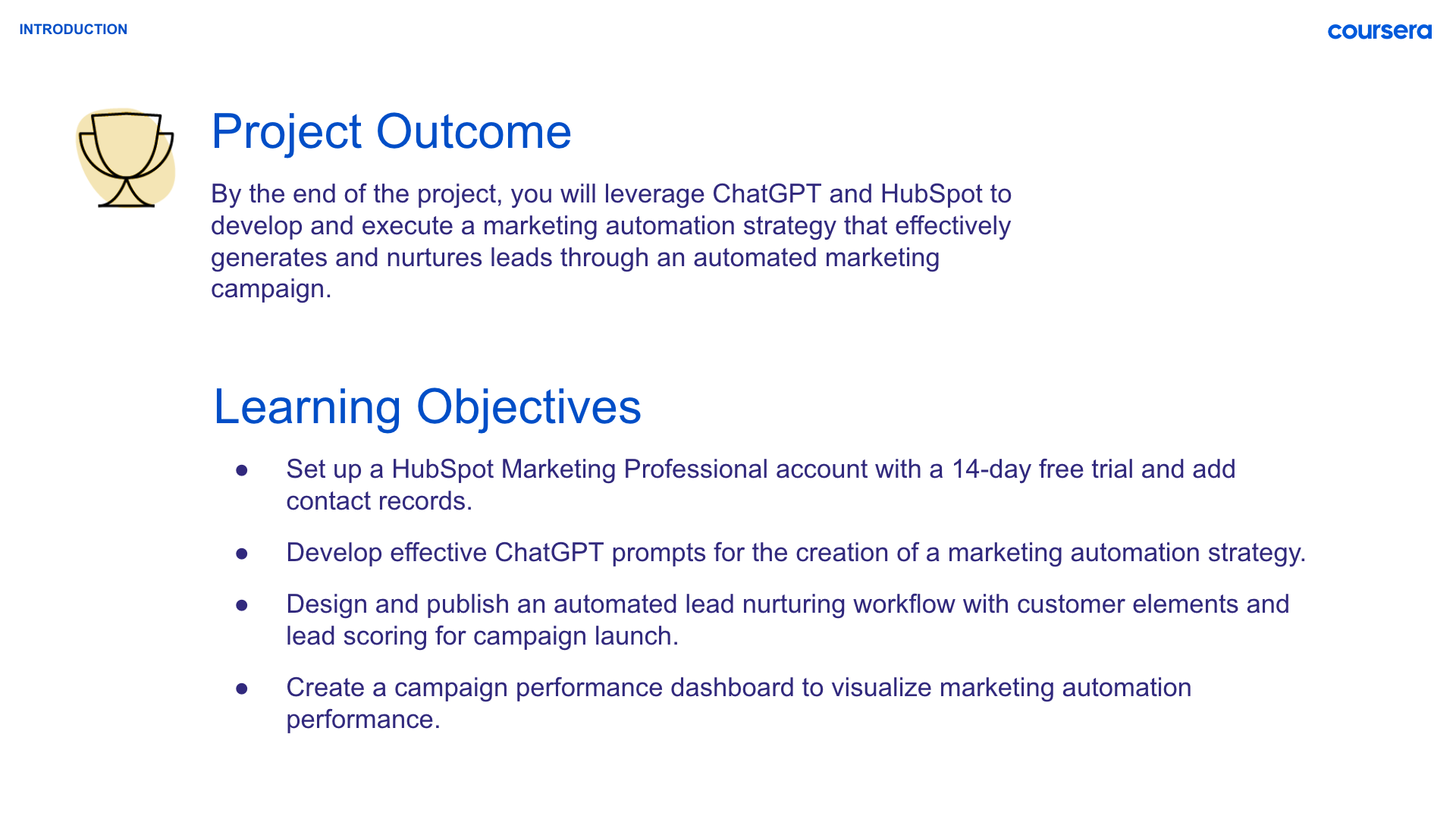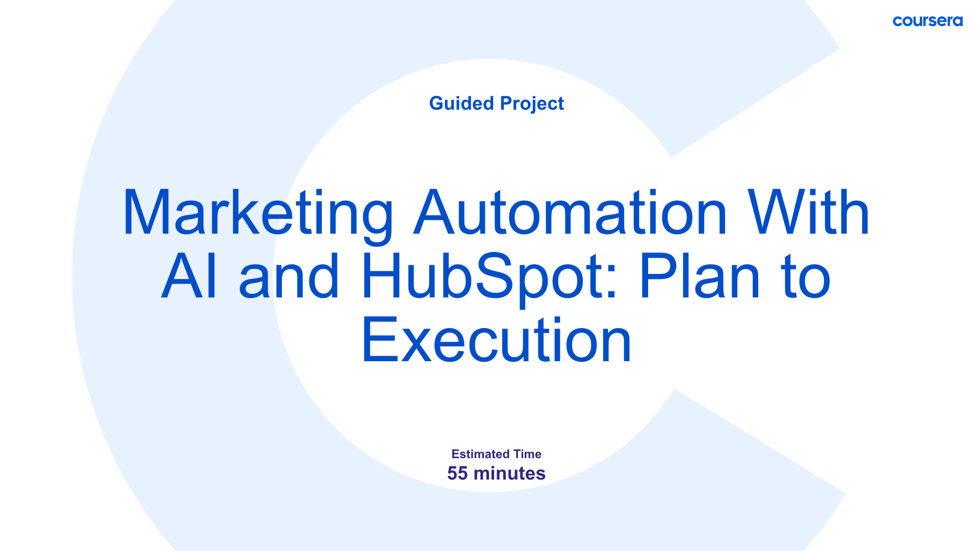 This Guided Project, led by Anthea Variend, an expert in Marketing Campaign Strategy, is designed to help marketing professionals, small business owners, and communications teams use GenAI and HubSpot to develop and execute a marketing automation strategy for lead generation and nurturing.