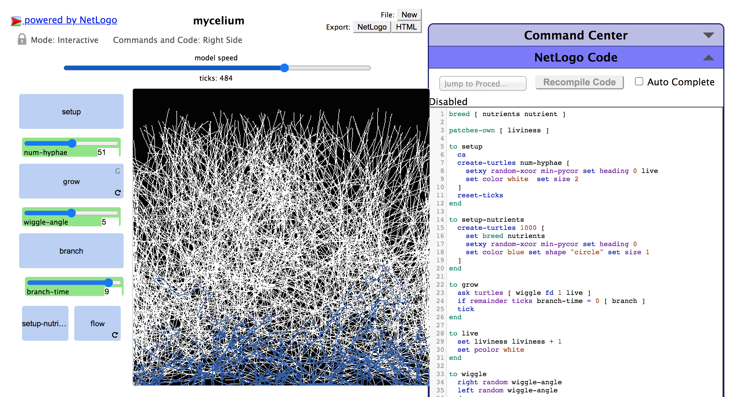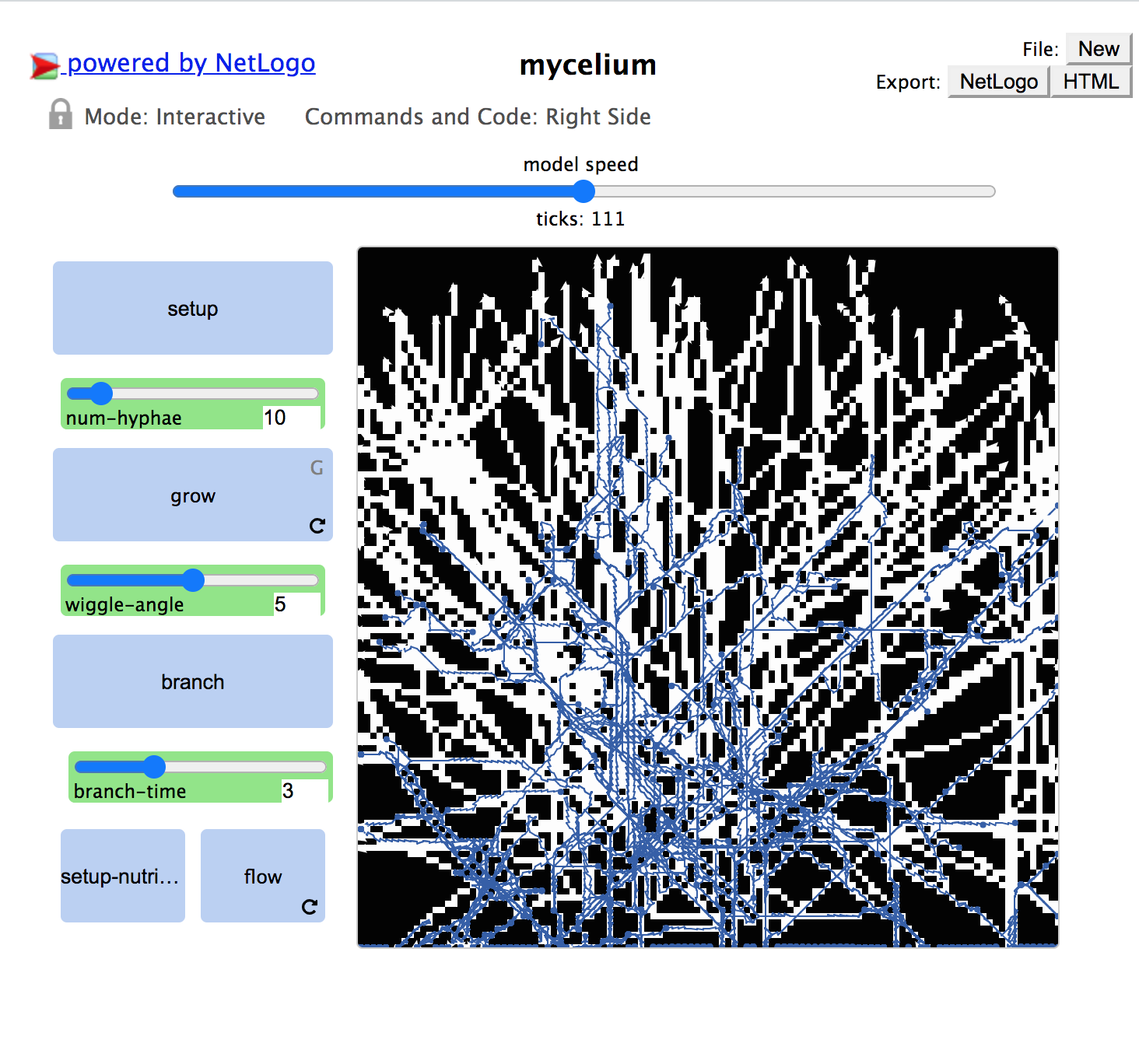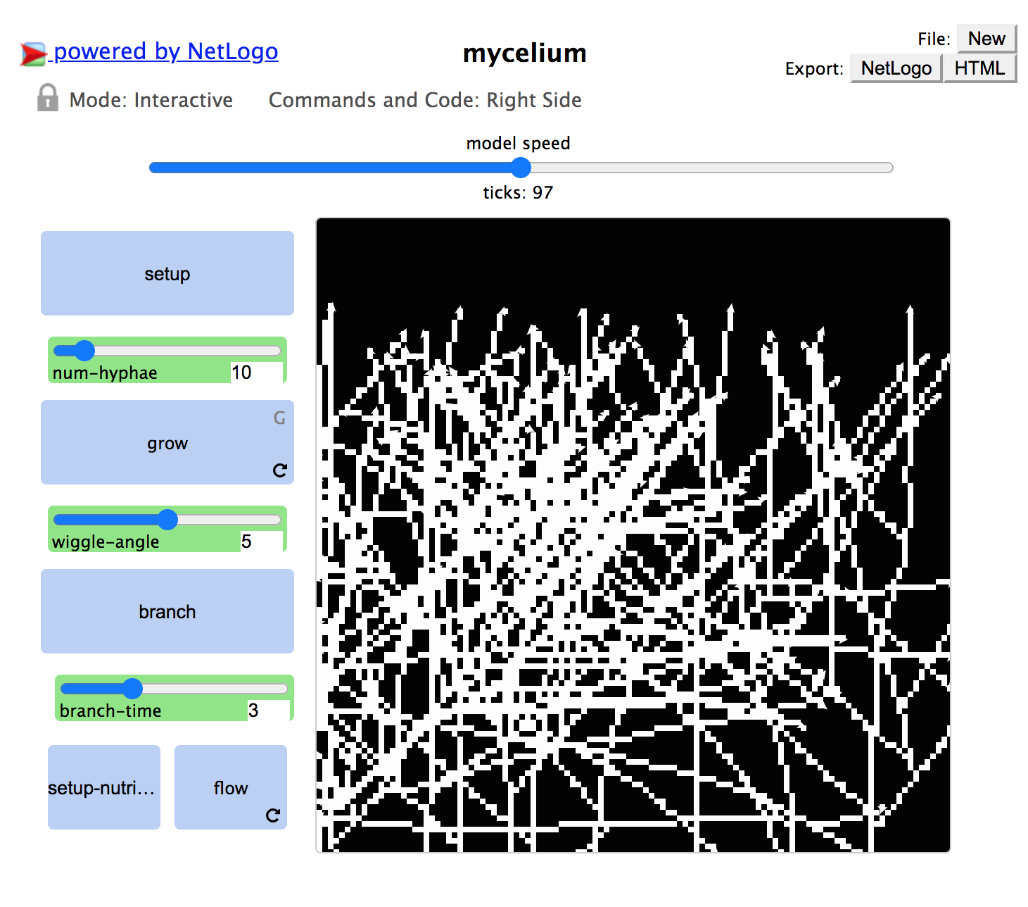 Create an agent based model that simulates possible mechanisms through which fungi mycelium grows and how nutrients flow within it.