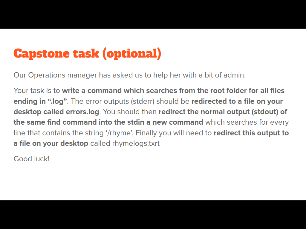 • Use Linux redirection operators with commands to manipulate and redirect data