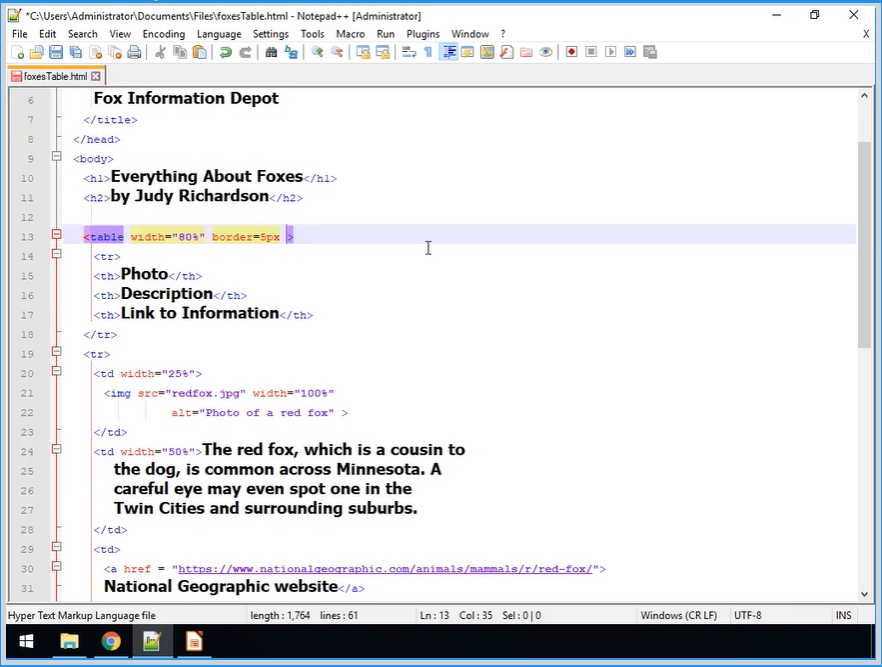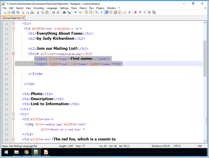 In this project, you will write the HTML code to incorporate tables and forms into a web page. You will use a text editor called Notepad++ to write your code, and the Chrome browser to display the resulting web page. HTML tables are used to organize and present data in a tabular format, making it easier to read for the web page visitor. Tables are also used to position items on a web page. Adding a simple form to the web page provides a method of interacting with visitors. By the end of the course, you will have created a web page that includes a table that displays and positions organized data, images, and a form.